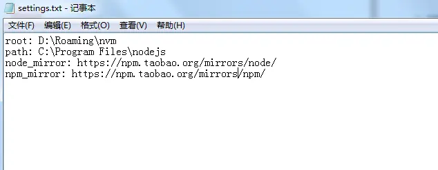 设置npm淘宝镜像:打开nvm安装文件夹,修改settings.txt,增加node_mirror:https://npm.taobao.org/mirrors/node/npm_mirror: https://npm.taobao.org/mirrors/npm/